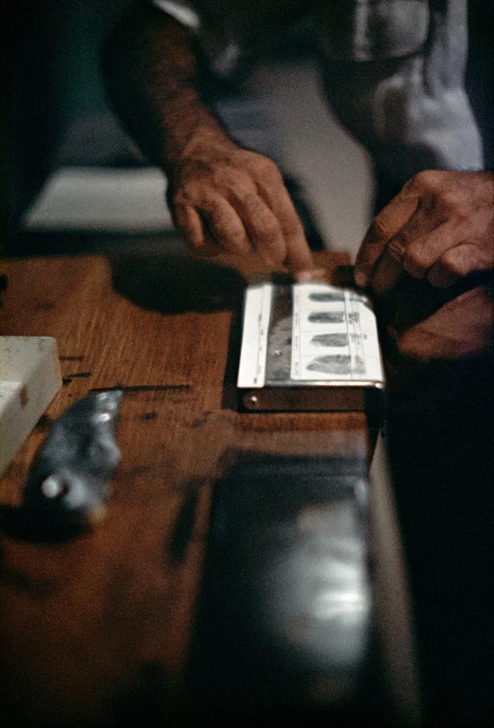 斯蒂德(Steidl)最近发表了帕克斯(Parks)另一篇出色的论文之一,该论文于1957年出版,题为“犯罪的气氛”。 在六个星期的时间里,他与记者罗伯特·华莱士(Robert Wallace)一起从美国到北,从北到南旅行,在警察行动期间跟随警察,访问了监禁中心,甚至是死囚室,以期描绘犯罪行为。 帕克斯(Parks)拒绝了主要的犯罪叙事,再次将自己的相机用作活动家,并倡导社会和政治排斥。